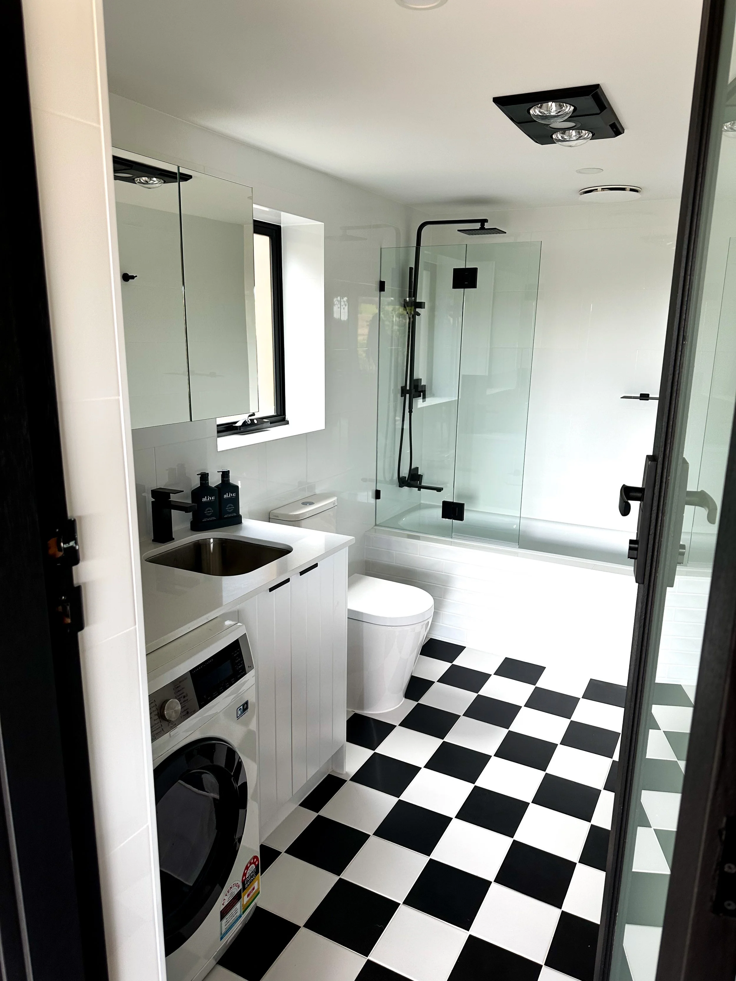 The entire basement of this home was renovated. A new bedroom - including new floors, feature staircase, new windows and blinds and wardrobe was added. The bathroom met our client’s brief - and had a checker black and white floor, in-built laundry facilities and shower over bath.