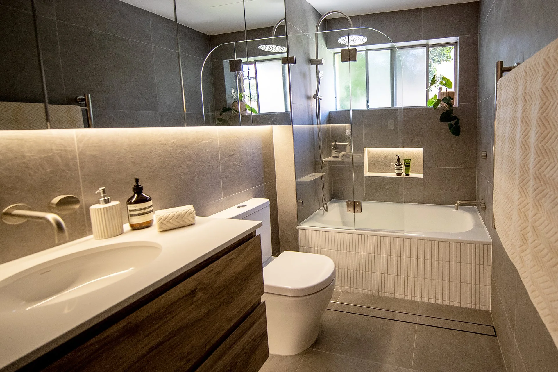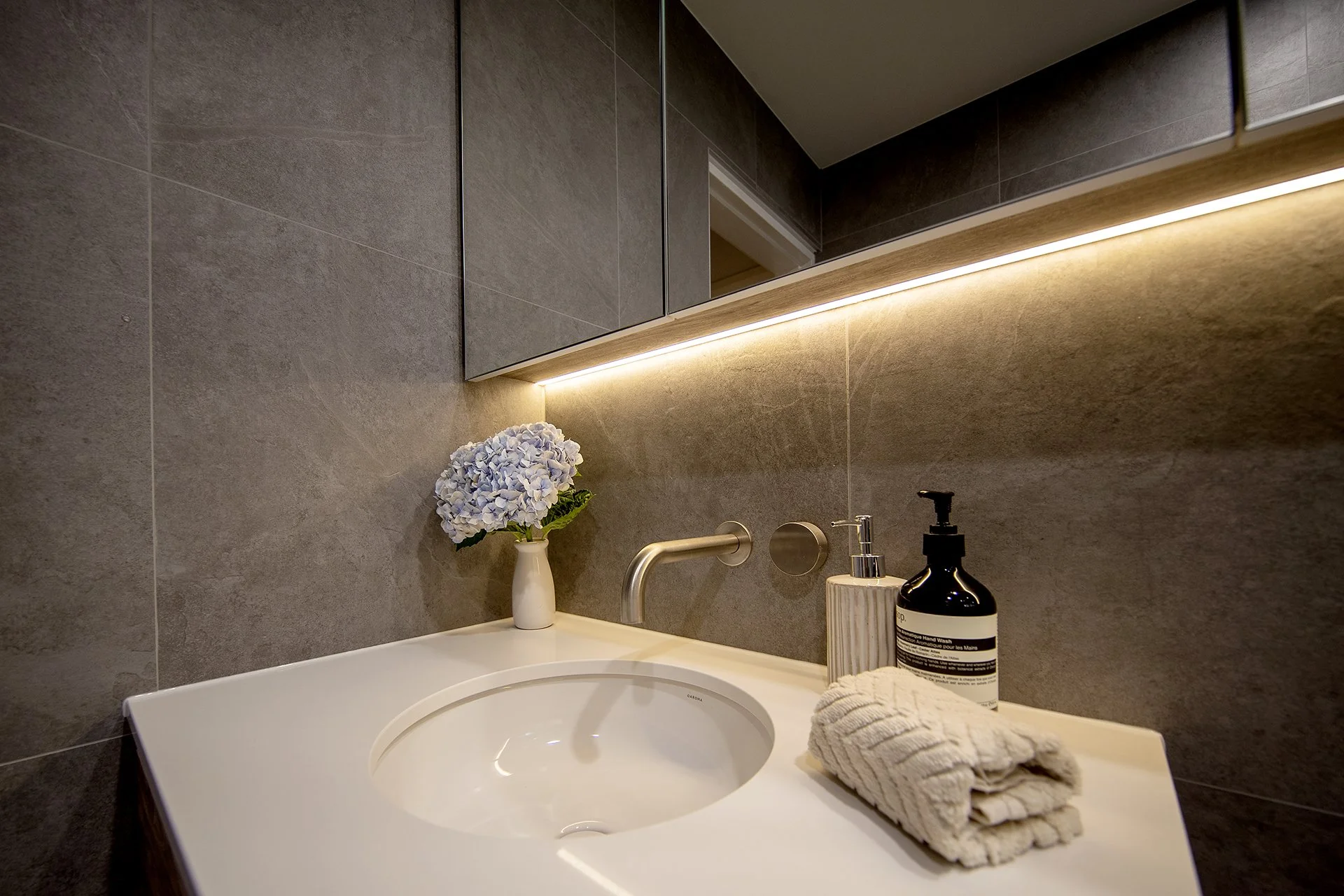 Project Dee Why was a small bathroom renovation. Although we had limited space to work with, we used design choices including a large format tile in one style, to create the illusion of a larger space. We designed a custom vanity, with a mirrored cabinet that stretched the entire wall, even sitting over the toilet. The room also featured beautiful brushed nickel fixtures from Reece, which elevated the entire look.